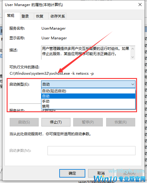如果不是自动,则点击下拉框选择自动。也可以查看到,正在服务的状态,服务状态可能是【正在运行】,但是win10的开始菜单还是打不开,那是因为服务没有完全运行,点击【确定】按钮,完成启动类型的设置