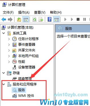 2.进入到【计算机管理】窗口,点击【服务和应用程序】→【服务】
