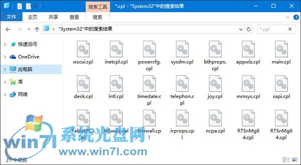2、在System32文件夹中搜索*.cpl,搜索结果中会显示出控制面板中的一些小工具。部分.cpl为第三方软件添加,这些软件会在控制面板中添加自己的入口。