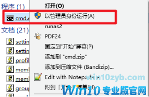 2、在开始菜单中输入“cmd”,然后以管理员身份运行