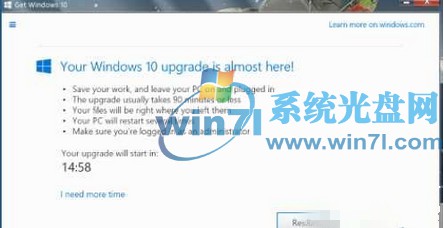 4、如果设置了预定升级,在升级开始前的15分钟用户会收到提示。提示出现时,可以点击”我需要更多时间“来重新设置预定或是取消掉升级。