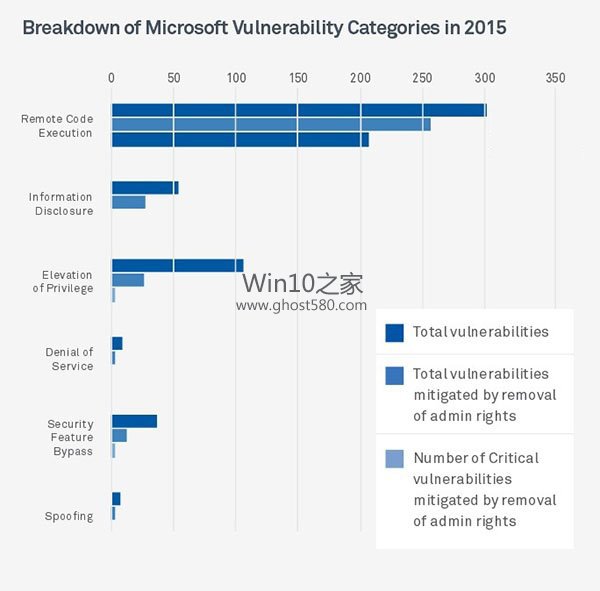 另外,在所有漏洞中,最常见的是远程执行代码漏洞,如果不使用管理员权限,85%的此类漏洞都无法被利用。