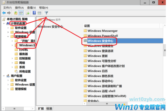 2.点击盘【计算机配置】>【管理模板】>【Windows组件】,右侧找到【Windows安全中心】打开