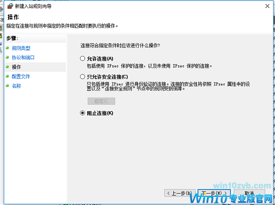 6.在连接符合条件的界面之中,请选择【阻止连接】,点击【下一步】。何时应用该规则选择【默认】即可。继续点击【下一步】。
