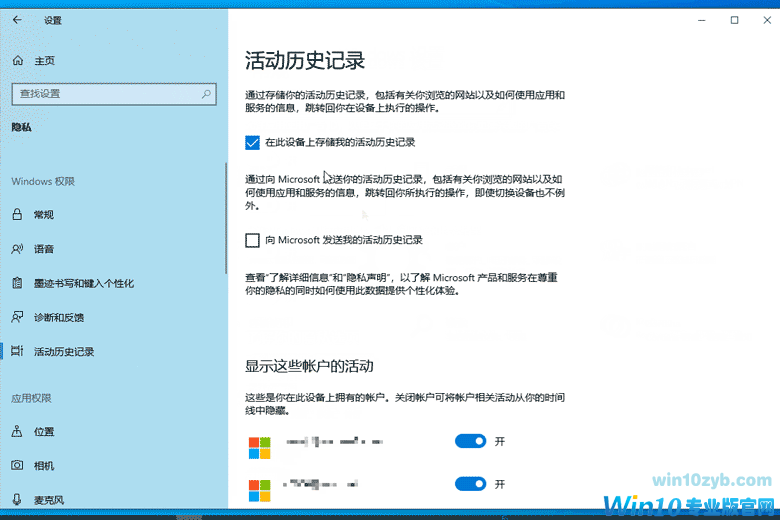 2.在“隐私”设置中,点击“活动历史记录”选项卡,勾选“在此设备上存储我的活动历史记录”,在任务视图中会显示活动历史记录。
