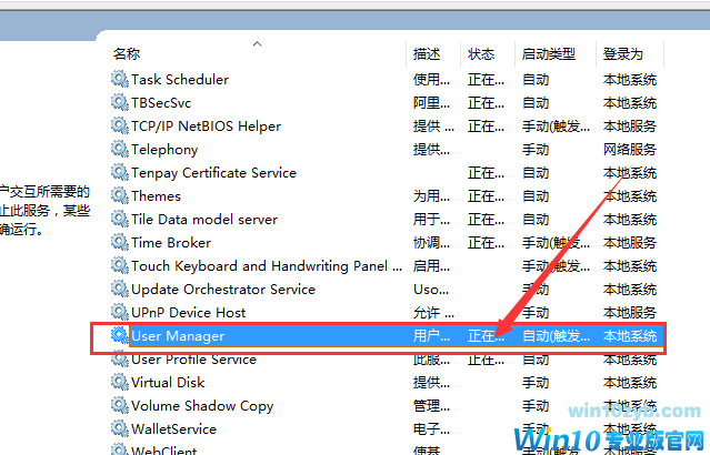 2.在打开的服务选项界面中找到“User Manager”,进入下一步。