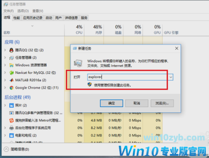 2、在新建任务中输入“explorer”,点击确定进行重置桌面图标,如下图所示: