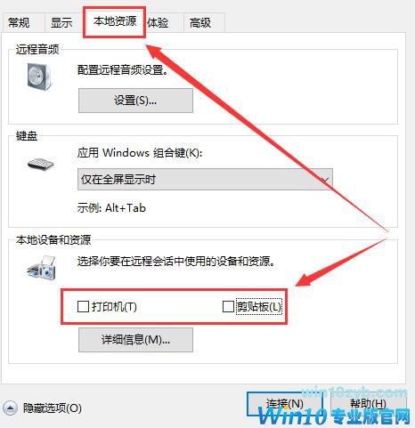 3、然后在【本地资源】选项卡中,我们将【打印机】和【剪贴板】全部取消勾选就行了。
