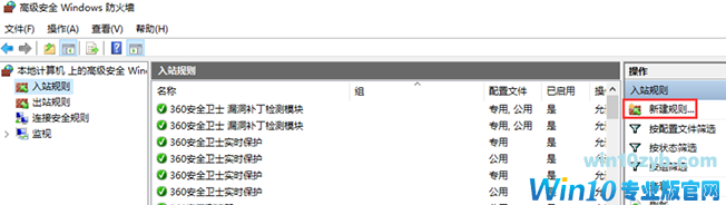 3.请继续点击【高级设置】,在【高级设置】界面,选中左侧的【入站规则】选项,然后点击右侧的【新建规则】。