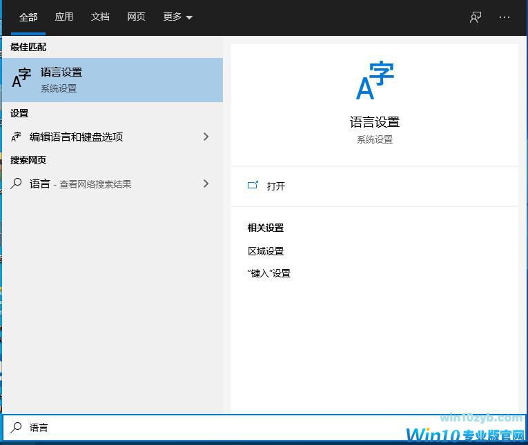 4、当然你也可以使用搜索栏(小娜),直接搜索语言即可找到该选项。