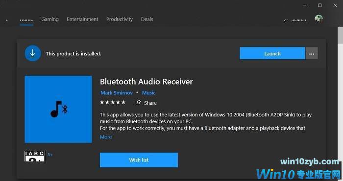 完成上述设置后,请移步至 Microsoft Store(传送门)、下载并安装“蓝牙音频接收器” 应用程序。