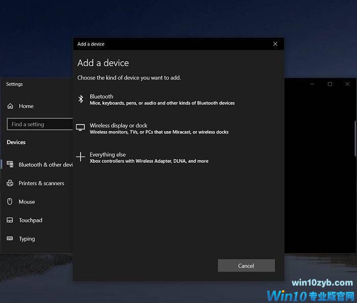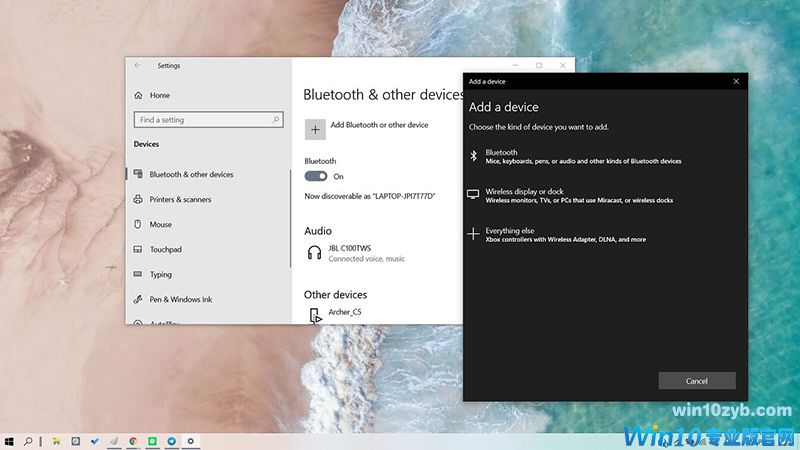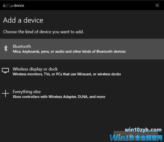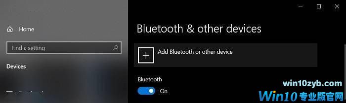 转到 Windows 10 设置 -> 设备 -> 蓝牙和其它设备,点击“添加蓝牙或其它设备”、并选择“蓝牙”。