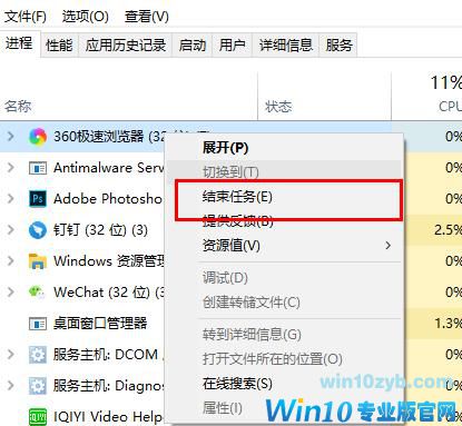 2、选择占用较高且无用的程序右击选择“结束任务”。