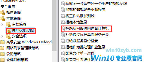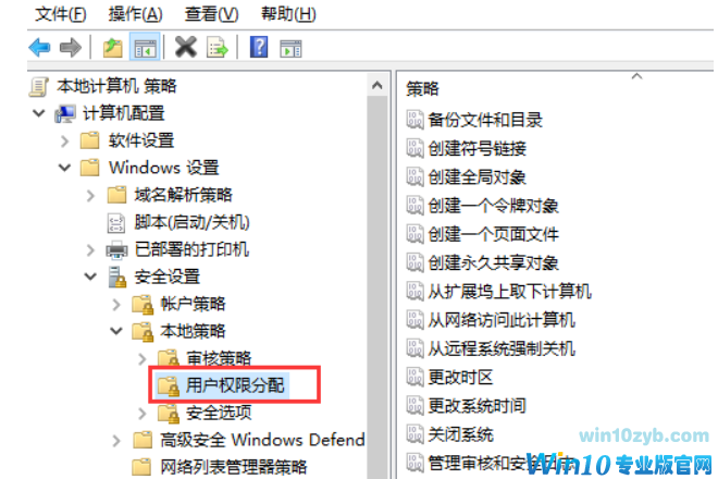 2、"计算机配置"->"windos 设置"->"安全设置"->"本地策略"->"用户权限分配"