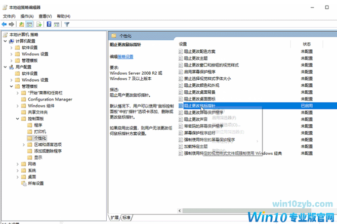 2.在“本地组策略编辑器”中,定位到以下位置“用户配置”——“管理模板”——“控制面板”——“个性化”中,点击右侧“阻止更改鼠标指针”。