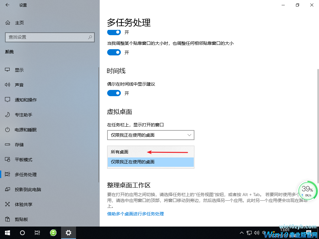 3、接着我们将右侧的页面找到按Alt+Tab组合键显示窗口,并调至所有桌面,就可以解决切换的问题了。