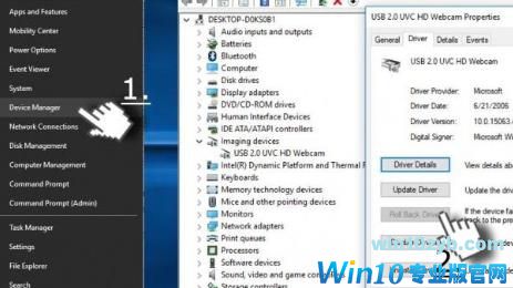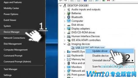 2、右键单击Win键,选择“ 设备管理器”。 查找影像设备并找到摄像头右键单击网络摄像头的名称,