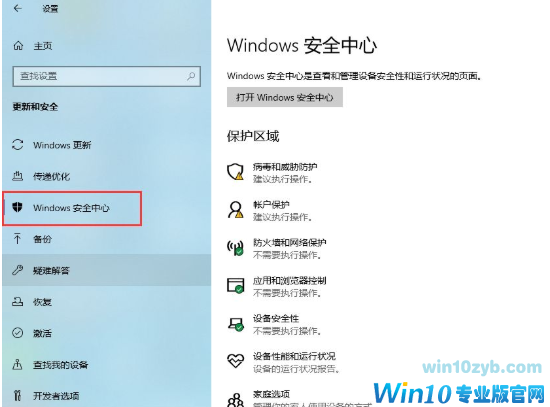 3、在左侧列表中找到并点击windows安全中心。