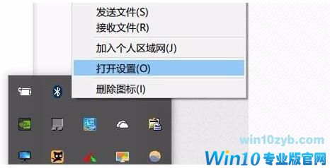1、右击右下角托盘区中的蓝牙图标,点击“打开设置”。