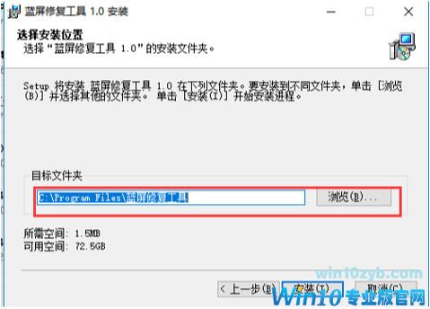 2、进入安装位置选择界面,您可以点击【安装】软件会默认安装,或者您可以点击【浏览】在打开的选择安装位置界面中,您可以自行选择蓝屏修复工具的安装位置,选择完成后点击【安装】就可以了;
