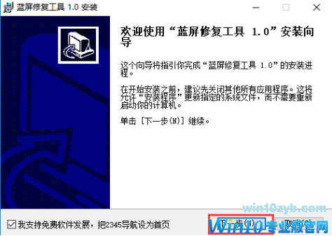 1、首先在本站下载蓝屏修复工具win10版软件包,下载完成后双击exe应用程序,进入安装向导界面,取消勾选左下角的【把2345导航设置首页】选项,选择完成后点击【下一步】;