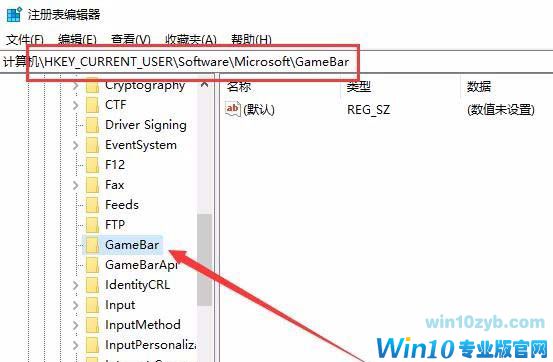 3、这时会打开Windows10系统的注册表编辑器,在注册表编辑器窗口中依次展开HKEY_CURRENT_USER/Software/Microsoft/GameBar注册表项。