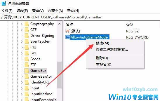 6、右键点击注册表键值 AllowAutoGameMode,然后在弹出菜单中选择“修改”菜单项。