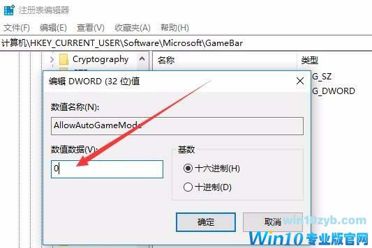 7、这时会弹出编辑窗口,把数值数据修改为0,然后点击确定按钮。这样重新启动计算机后,就会自动关闭了游戏模式,如果想再启用游戏模式,可以把数值修改为1,或是直接删除该键值就可以了。