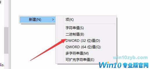 4、在右侧的空白位置点击右键,在弹出菜单中选择“新建/Dword(32位)值”菜单项。