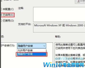 5、最后直接选择已启用,在用户安装行为下选择隐藏用户安装并点击确定即可。如下图所示: