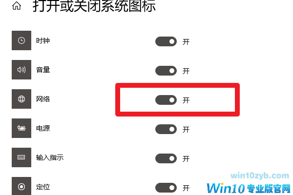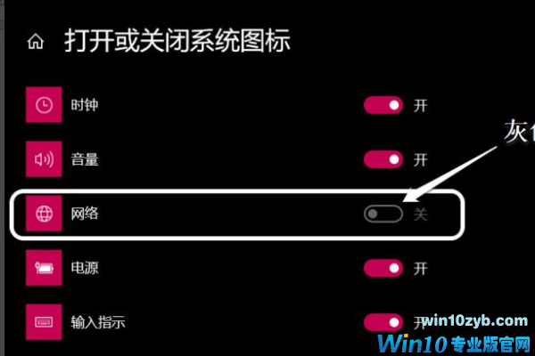3、在 打开或关闭系统图标 窗口中,我们发现【网络】图标的开关呈灰色为不可使用状态;如下图所示: