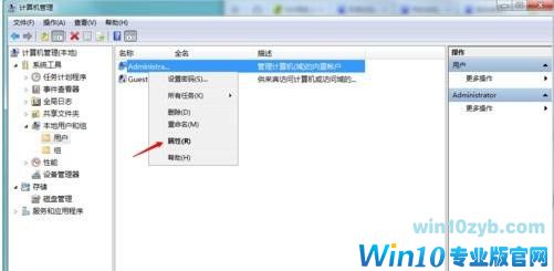6、在右方用户列表中,右键点击【administrator】选择属性选项;