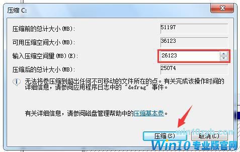 4、接着出现压缩界面,需要调整【输入压缩空间量】,也就是我们增加一个分区空间大小,根据实际情况进行划分,然后点击【压缩】。