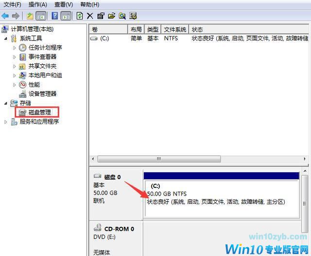 2、计算机管理界面左侧点击【磁盘管理】,右侧可以看到我们电脑硬盘的信息。
