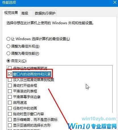 4、在“视觉效果”界面下勾选“窗口内的动画控件和元素”,点击应用并确定。