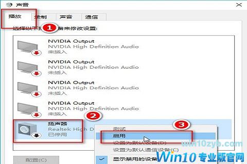 4.在“播放”选项卡下,点击“扬声器”,右键一下,选择“启用”,这样就可以用耳麦听到声音了;
