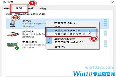 5.在“录制”选项卡下,点击“麦克风”,右键一下,选择“设置为默认设备”和“设置为默认通信设备”。然后点击麦克风属性,根据需要调整一下;