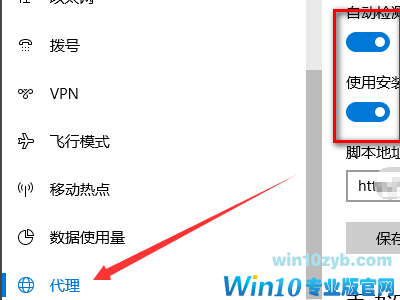 3、左侧找到代理,然后将右侧的自动检测设置和使用程序脚本开关全部关闭。