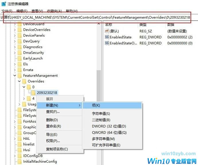 定位到 “计算机\HKEY_LOCAL_MACHINE\SYSTEM\CurrentControlSet\Control\FeatureManagement\Overrides\0\2093230218”。在右侧空白区内,新建两个 “DWORD(32 位)值”,分别命名为 “EnableState”(赋值 “2”)和 “EnabledStateOptions”(赋值 “0”)。