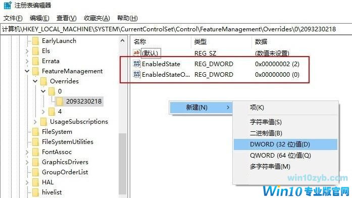 定位到 “计算机\HKEY_LOCAL_MACHINE\SYSTEM\CurrentControlSet\Control\FeatureManagement\Overrides\0\2093230218”。在右侧空白区内,新建两个 “DWORD(32 位)值”,分别命名为 “EnableState”(赋值 “2”)和 “EnabledStateOptions”(赋值 “0”)。