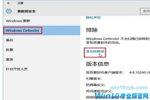3.下一步,在更新和安全设置模块左侧找到Windowsdefender选项并点击,点击右边界面的添加排除;