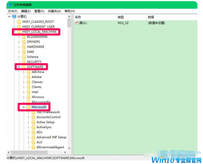 3.然后在打开的注册表编辑器界面中依次展开HKEY_LOCAL_MACHINE/SOFTWARE/Microsoft,进入下一步。