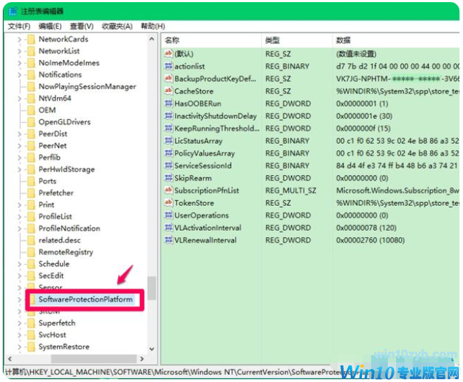 6、在SoftwareProtectionPlatform的右侧找到BackupProductKeyDefault,双击BackupProductKeyDefault打开改选项,在对话框中您查看到的BackupProductKeyDefault数值数据就是win10激活密钥了。