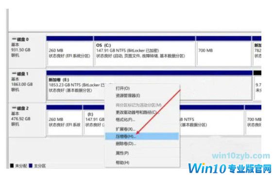 3、选择压缩卷选项:选择硬盘,鼠标右键打开菜单,选择压缩卷选项。