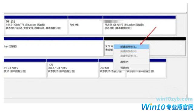4、创建简易卷:将拓展出去的储存空间,鼠标点击打开菜单,选择新建简单卷选项,人们就能够创建D盘了。