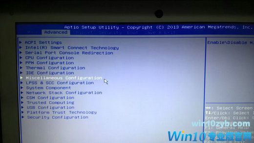打开BIOS,找到miscellaneousconfiguration(杂项配备)设定选项。