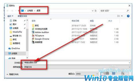 4、将文档储存,命名为“修补白图标.bat”,储存类型为全部文件,把它保存到桌面;