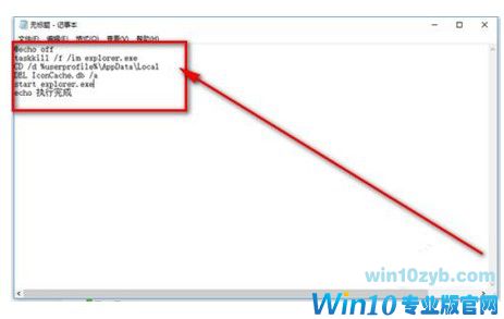3、新建一个TXT文档,在文档中输入代码“@echooff回车taskkill/f/imexplorer.exe回车CD/d%userprofile%\AppData\Local回车DELIconCache.db/a回车startexplorer.exe回车cho实行完成”;