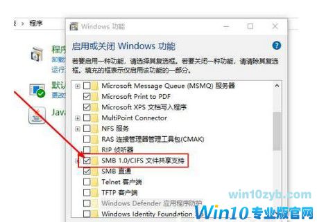 4、找到“SMB1.0/CIFS文件共享适用”勾选起来再确定;