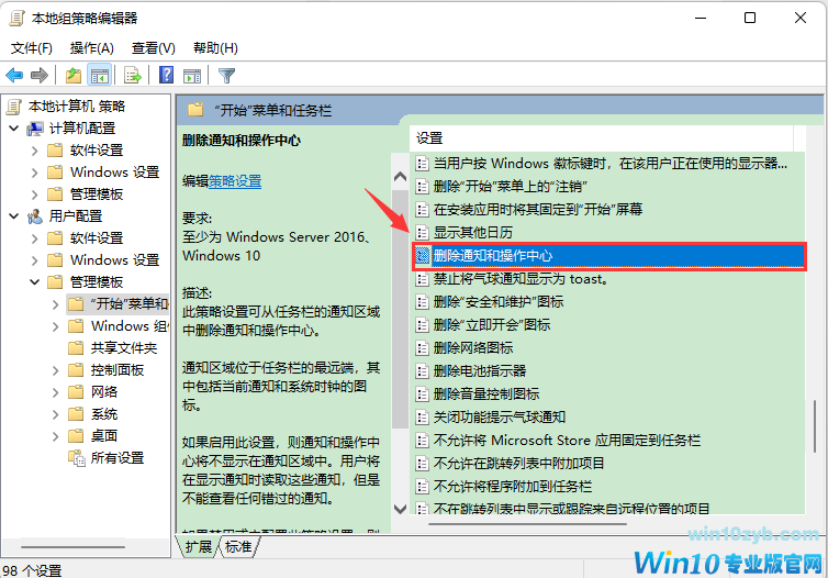 4、随后寻找“删除通知和操作中心”此项,双击鼠标该栏。